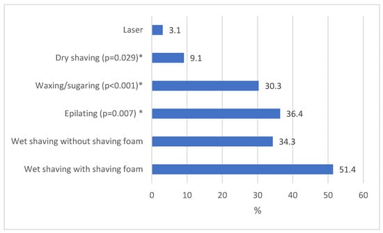 Of the dancers, 91.4% stated that they regularly remove unwanted hair from the armpit area, followed by 82.7% who stated that they remove intimate hair, with 77.1% hair from the legs, 17.1% from the chest, and 5.7% from the back. Figure 3 shows the hair removal method used. The majority of dancers use wet shaving with (51.4%) or without (34.1%) shaving foam.