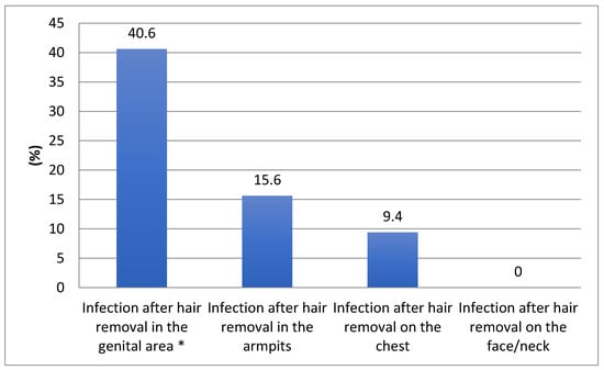Figure 4 shows the consequences after hair removal by shaving. Infections after hair removal (predominantly shaving) in the intimate area represent the most frequent consequences.