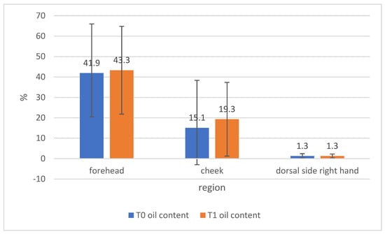 The data collected in the skin analysis regarding the oil level of the skin at both time points showed values in the area of the cheek as well as on the dorsal side of the hand that were to be rated as “dry”. In the area of the forehead, the mean value for the fat content was to be classified as “normal”. No significant changes in the values were observed between the two time points T0 and T1 (Figure 5).