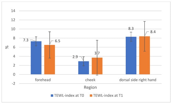TEWL index values of the professional dancers at time points T0 and T1; n = 29.