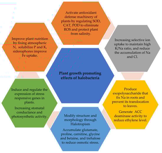 Halobacteria possess plant growth promoting characteristics, i.e., Reang et al. [62] isolated halotolerant and halophilic bacteria belonging to Halomonas pacifca, H. stenophila, Bacillus haynesii, B. licheniformis, and Oceanobacillus aidingensis. These isolates were able to produce indole acetic acid, solubilized phosphate, and potash and showed N-fixing capacity. There is a growing number of publications on plant growth promotion by halophilic rhizobacteria isolated from the roots of halophyte species [63,64].