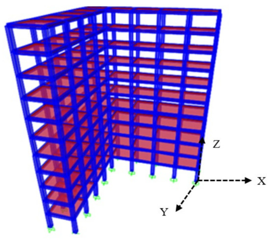A high-rise, G+10-storey, L-shaped, unsymmetrical, reinforced, concrete building was considered in this study. The total plan area of the building is 324 m2. The plan and elevation of the unsymmetrical building are shown in Figure 1, while its 3D view is shown in Figure 2. The total height of the building is 44 m (Figure 1b) with an inter-storey height of 4 m. The collapse phenomenon is the combination of plastic and dynamic behaviour of the structural members. Though distributed plasticity provides slightly better results, in terms of modelling difficulties the default plastic hinges are assigned as per ASCE 41–17. The hinges were assigned in beams and columns at the starting and end portion of the member. The beam elements were assigned with M3 hinges, whereas for columns it was P-M2-M3 hinges. In the study, the lateral load-resisting system with bracings, URM infills, etc., was not included. The slab members were provided along with the rigid diaphragm action which was considered at each floor level that inhibited the actual behaviour of the building.