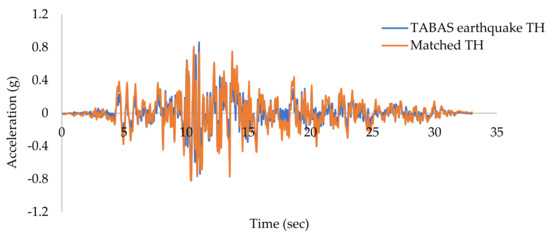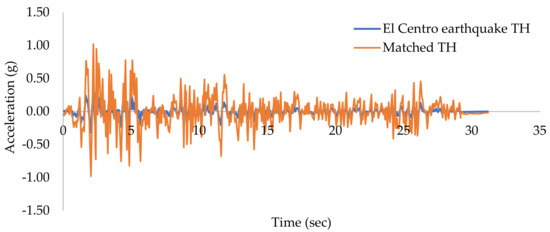 Using SAP2000, a NLTHA was carried out [49,50,51,52]. The investigation made use of the compatible ground motion time history (Figure 3, Figure 4, Figure 5, Figure 6 and Figure 7). Since the building plan orientation is asymmetrical, each building instance was subjected to independent unidirectional (Ux direction) and bidirectional (Ux and Uy) loads. The structure must be constructed for the simultaneous impacts of a full design earthquake loading in one horizontal direction plus 30% of a design earthquake load along a second horizontal direction, according to IS: 1893–2016. The matching El Centro time history data were chosen for the bidirectional loading condition since the El Centro ground motion was more prominent in the previous research.