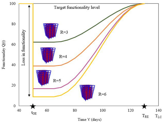 Graphical representation on functionality curves with respect to R factor. The time of occurrence of a seismic event is designated as tOE, its recovery time is designated as TRE.