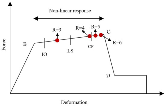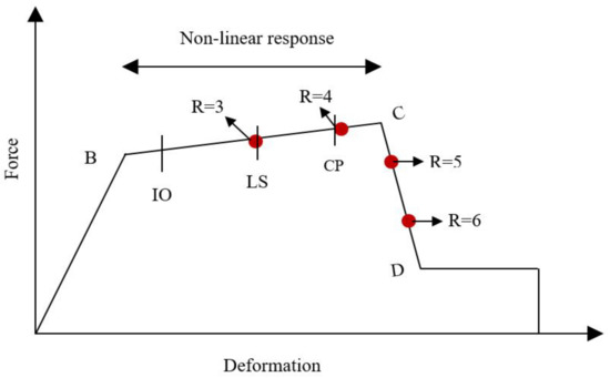 The extent of the building damage caused by the earthquake determines the structure level of performance. Immediate occupancy (IO), life safety (LS) and collapse prevention (CP) are three different performance levels (Figure 9). According to the American Society of Civil Engineers [54], the member non-linearity was accounted for in the form of plastic hinges. To assess the non-linear behaviour of the structure, plastic hinges were placed on the structural parts, such as beams and columns. With the structural member non-linearity, the NLTHA was performed to assess the structural capacity and performance level. The rotational capacity and constraints of the plastic hinges form the basis of the non-linear behaviour of the structure. The study considered the plastic hinge rotation limitations of 0.01, 0.025 and 0.050 for IO, LS and CP levels, respectively.