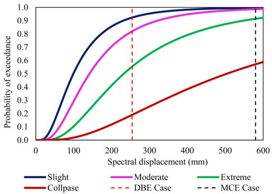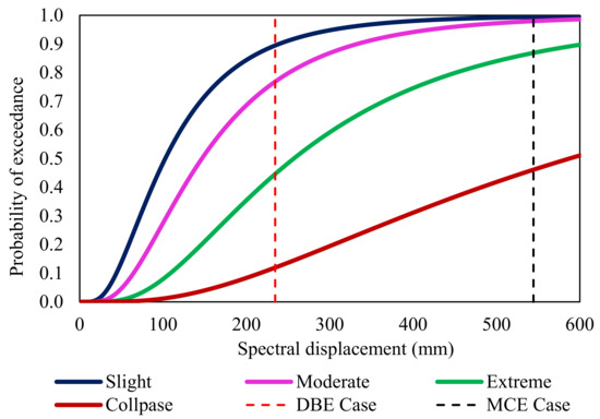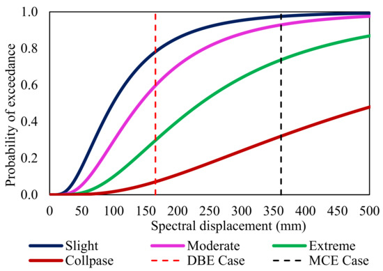From the fragility curves, the probability of the building exceeding each damage state was evaluated. The vertical line that intersects the fragility curves of various damage states was shown with regard to the spectral displacement at each design level. The likelihood percentage of exceeding for that particular damage condition is provided by the intersection point.