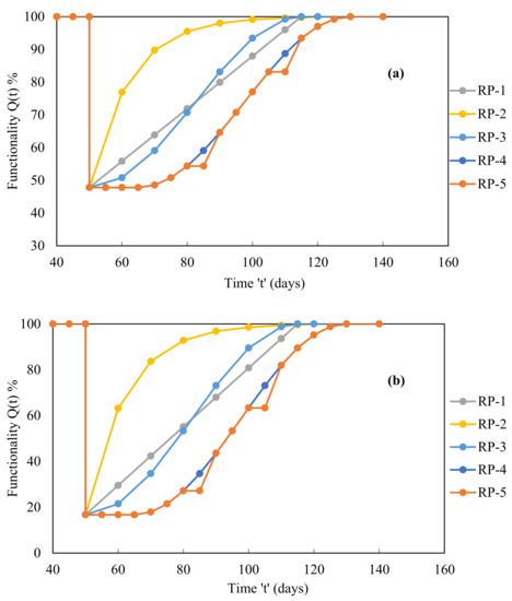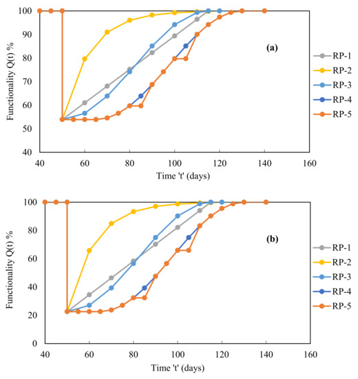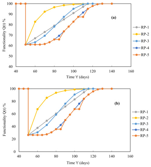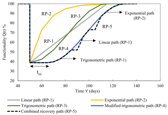 In addition to the ‘toi’ parameter, the modified trigonometric path is the fourth recovery path (RP-4) which has an initial delay in the recovery process, whereas the combined recovery path is the fifth recovery path (RP-5) which has a certain breakdown in the recovery process (Figure 16). The functionality Equation (3) now includes the new argument ‘toi’. Based on this, the functionality and recovery equations were modified as follows: