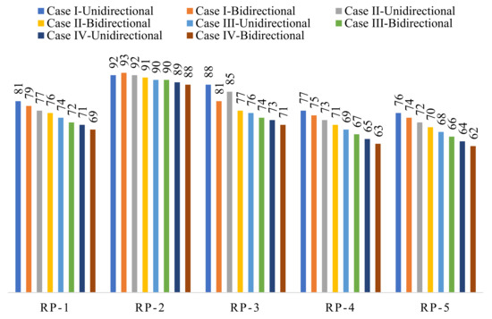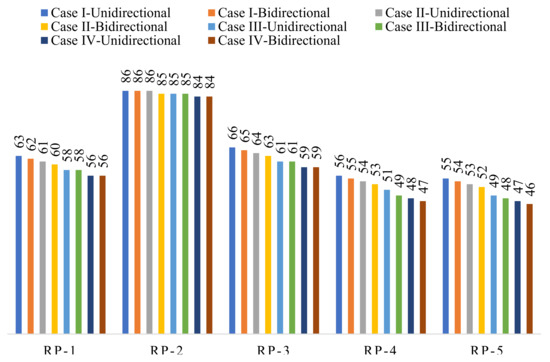 At the DBE design level, building resilience corresponds to Case I ranging from 81% to 76%, and at the MCE design level resilience ranges from 63% to 55% (Table 12). When compared to the DBE level for RP-5, the highest reduction in resilience at the MCE level was around 28%. The recovery path RP-2 was not always realistically feasible, as was already mentioned. The remaining recovery pathways were contrasted with each other (RP-1, RP-3, RP-4 and RP-5). When compared to the standard recovery path RP-3, roughly 13% lesser resilience was seen at the DBE level and 15% less was seen at the MCE design level for the proposed recovery path RP-4. This resulted from the recuperation process breaks and the early delay in the beginning. At the DBE and MCE design levels, the maximum loss of resilience (LOR) was discovered to be approximately 24% and 45%, respectively.