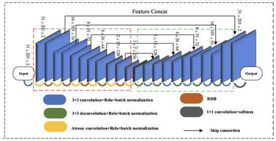The main function of the encoder is to extract seismic signal features through down-sampling. It is composed of five groups of feature extraction units and the atrous convolution of the bottom layer. Each group of feature extraction units is composed of atrous convolution, an activation function, batch normalization, and a residual dense block, in which the activation function and batch normalization are the same as those of the input layer.
