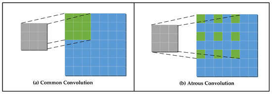 The implementation principle of atrous convolution is shown in Figure 3. Figure 3a shows a common convolution with a receptive field size of 3 × 3. In Figure 3b, atrous convolution with a dilated coefficient of 2 is added on the basis of the common convolution with a 3 × 3 receptive field, and the field of the convolution kernel is increased to 5 × 5. Let the convolution kernel size of the convolution layer be k × k; when the dilated coefficient of the atrous convolution is , the calculation form of its receptive field size is shown in Formula (3).
