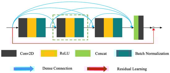 The residual dense block is mainly composed of dense connections and global residual learning, and the structure is shown in Figure 4. The dense skip connection connects each current convolutional layer to all convolutional layers, realizing the interconnection between all layers, as shown by the blue arrows in Figure 4. This method deepens the depth and width of the network to a certain extent, integrates the information about all layers as far as possible, forms a continuous memory mechanism, and enhances the feature extraction ability of the model. The global residual learning gives the ability of backoff to the residual dense block by adding a directly connected skip connection between input and output, as shown by the red arrow in Figure 4. In this way, the residual learning can automatically select whether to perform feature extraction through the three convolution layers according to the effect of gradient descent, directly skip the convolution layer and select the skip connection to perform feature flow, or combine the features of the three convolution layers and the skip connection to perform output, thereby mitigating the problems of gradient vanishing and gradient exploding caused by deepening of the number of network layers and making the network easier to train. For each unit of the residual dense block, as shown in the green dashed-line box in Figure 4, batch normalization and the activation function are added after the convolution layer so that the input of each layer has a stable distribution, which can effectively avoid gradient diffusion and improve the generalization ability and convergence speed of the network.