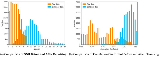 To preliminarily validate the feasibility of the denoising of the ARDU model, the model was tested on the prepared test set, and the test results are shown in Figure 7. The orange bars in the figure represent the seismic signal with noise before denoising, and the blue bars represent the seismic signal after denoising. According to the calculation in Figure 7a, the average SNR of the signal in the test set before denoising was 3.77 dB and the average SNR of the signal after denoising was 11.59 dB. The improvement in the SNR shows that the ARDU model can effectively remove the noise in seismic signals and enhance signal quality. According to Figure 7b, the correlation coefficient of the signal in the test set before denoising was mainly in the interval [0.69, 0.87] and the average correlation coefficient value was 0.8024. After denoising with the ARDU model, the correlation coefficient interval is increased to [0.87, 0.99], the average correlation coefficient value is 0.9484, and the correlation coefficient is close to 1. This shows that the ARDU model can protect effective signals and reduce waveform distortion. To sum up, the ARDU model has the feasibility of denoising seismic noise in the co-frequency band and it can significantly improve the quality of seismic signals.