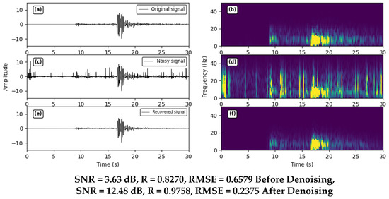 According to the frequency band range of seismic signals, co-frequency band noise was divided into medium-high-frequency noise, low-frequency noise, and mixed-frequency band noise, and the denoising performance of these three kinds of co-band noises was tested using the ARDU model to verify the effectiveness of the model for different noises. The test results are shown in Figure 8, Figure 9, Figure 10 and Figure 11, where (a), (c), and (e), respectively, represent the time-domain seismic signals with labels, seismic signals with noise, and the denoised seismic signals, while (b), (d), and (f), respectively, represent the time-frequency domain signals of (a), (c), and (e). Figure 8 shows the medium-high-frequency noise. The frequency of the medium-high-frequency noise was relatively high, and the overlapping range with the frequency band of the seismic signals was small. After denoising, the SNR of the signals increased by 12.45 dB, increased by 25.18%, and the RMSE reduced by 76.16%. Figure 9 shows the low-frequency noise. The low-frequency noise in the co-band seriously overlapped with the frequency band of the seismic signals, and the noise and seismic signals were poorly separated. Compared to medium-high-frequency noise, denoising is more difficult. After denoising, the SNR of the signal increased by 10.41 dB, increased by 30.03%, and the RMSE reduced by 70.68%. Figure 10 and Figure 11 shows the mixed-frequency band noise. The mixed-frequency band noise contained multiple frequency components, and it seriously overlapped with the frequency band of the seismic signals, so it was difficult to reduce the noise. After denoising, the SNR of the signal increased by 9.91 dB, increased by 27.34%, and the RMSE reduced by 62.27%. To sum up, the ARDU model can efficiently remove different types of noise, improve the SNR of the signals, protect effective signals, and reduce waveform distortion.