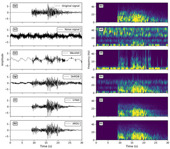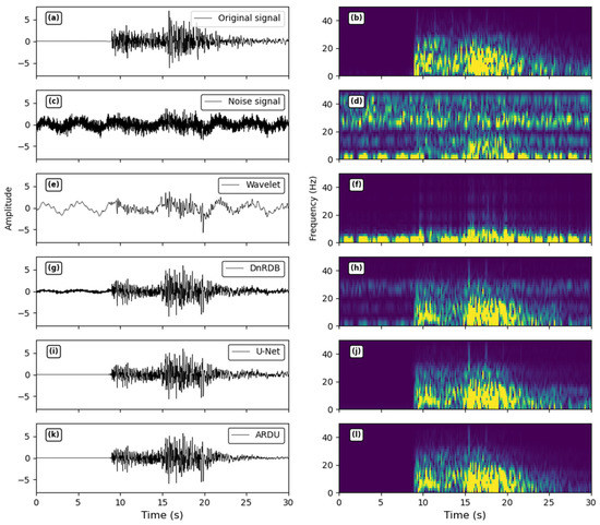 To further verify the effectiveness of the ARDU model on the noise reduction in actual seismic signals, comparison experiments were conducted between the ARDU model and the DnRDB model, the U-Net model, and the RDBU model. The average signal-to-noise ratio was used to evaluate the noise reduction performance of the model, which was obtained using a blind estimation algorithm of the signal-to-noise ratio. Experimental results are shown in Table 4 and Figure 14. Among them, the picture shows the denoising results of four noise reduction methods on the mixed-frequency noise in the same frequency band. Here, (a) and (b) are the actual seismic signals in the time domain and the time-frequency domain, and (c) and (d), (e) and (f), (g) and (h), and (i) and (j) are denoising signals in the time domain and time-frequency domain of the DnRDB model, the U-Net model, the RDBU model, and the ARDU model, respectively.