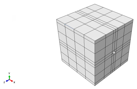 Mirzaghobanali et al. (2017) [2] differentiated between the geometry of the end and middle blocks; the blocks here are considered as having the same geometry. The blocks are representative of the individual rock layers within the geological rock profile and remain fixed at the ends, allowing only the middle block to move in the vertical, y, plane. The blocks were 500 mm (L) × 500 mm (W) × 500 mm (H). A hole with a diameter equal to the bolt under investigation was extruded through the centre of the cube in the ZY plane. Figure 2 illustrates the concrete box with a 28 mm extruded hole.