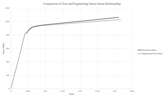 where the subscript E represents engineering stress/strain and the subscript T represents true stress/strain. As part of achieving calibration, this was necessary to ensure the accuracy of testing as it was compared with the experimental results obtained from ACARP Project C27040. A comparison of the engineering and true stress–strain curve for the calibrated model can be seen below in Figure 3.