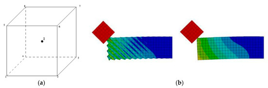When modelling steel and concrete members with ABAQUS, one of the main issues is addressing convergence due to the extensive number of contacts. This is particularly prevalent in the double shear test model at the contacts between the cable bolt and the concrete boxes. Therefore, the 8-node linear brick element, C3D8R, with reduced integration and built-in hourglass control will be used. The linear brick element contains a single integration point at the centre of the brick with 8 nodes forming the 1 × 1 × 1 cube. The reduced integration model is ideal when subject to plastic behaviour [52]. However, in conjunction with this, it is necessary to apply hourglass control because of the reduced stiffness of the reduced integration model. This will aid the meshing process and the overall run time of the model. Figure 6 shows the schematic diagram of the C3D8R model whilst highlighting the effects of hourglass control.