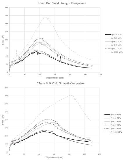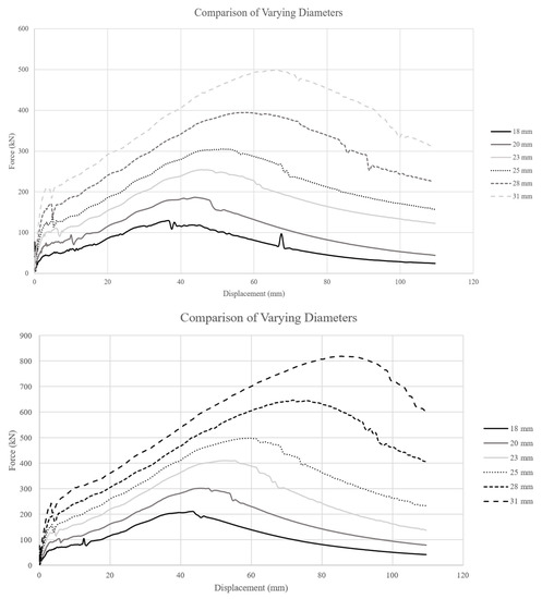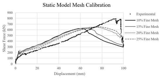 Mesh size was determined by comparing the trends of numerical and experimental data. The coarsest mesh that would minimise computational time and produce accurate results was selected. Seeding sizes of 10%, 15%, 20% and 25% of the bolt’s diameter were selected as the fine mesh portion, whilst the outer boundary was assigned double this value for static testing. For dynamic testing, an optimal mesh was selected by considering seeding sizes of the dynamic load. The results of various seeding were compared against the experimental results and can be seen in Figure 7.