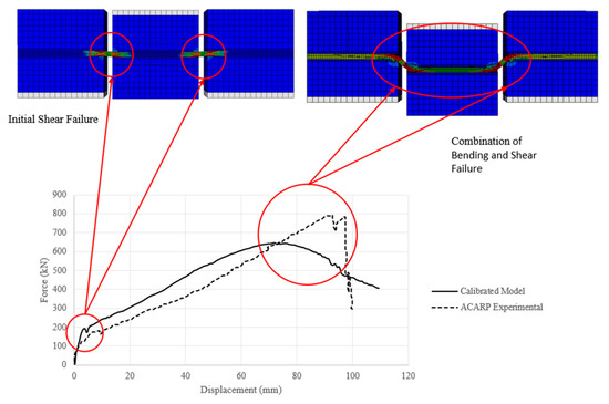 To induce a fracture, ABAQUS requires shear damage properties for damage for ductile metals to be defined and hence, a fracture energy is required. Fracture energy is defined as the required energy per unit area to change a fracture surface from an initial unloaded state to complete separation [47]. This is calculated as the work carried out to achieve fracture and effectively calculate the area underneath the respective stress–strain curve [48]. A Python code was written to determine the specific fracture energy for all steel grades (see Appendix A). The fracture energy for the calibrated model was calculated as 336,302 N/mm. The fracture energy will vary according to the steel grade.