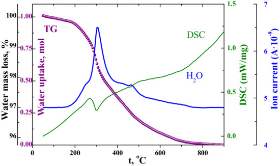 The amount of water uptake was measured via thermogravimetry (TG) coupled with the differential scanning calorimetry (DSC) method. The results are presented in Figure 2. As we can see, the initially hydrated composition loses mass due to water release that was confirmed by MS-results. No other volatile components were detected. The main mass loss happens at ~ 200–400 °C, which is confirmed by the signal on the DSC-curve (green line in Figure 2). The dissociative water intercalation into the crystal structure of layered perovskites is possible due to the placement of hydroxyl groups in the rock salt space of the layered framework [62]: