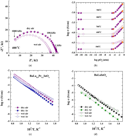 The Nyquist plots for the composition BaLa0.9Pr0.1InO4 obtained under dry and wet air at 400 °C (a), the dependencies σ – pO2 for the composition BaLa0.9Pr0.1InO4 (violet symbols) at dry (closed symbols) and wet (open symbols) atmospheres (b), the dependencies σ –1000/T for the compositions BaLa0.9Pr0.1InO4 (c) and BaLaInO4 [56] (d).