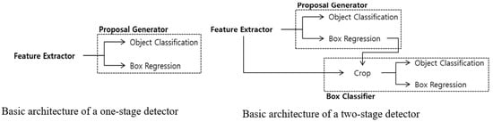 As shown in Figure 1, the one-stage detector has a YOLO model and a Single-Shot Multi-Box Detector (SSD) model. Herein, the SSD model maintains the speed while increasing the detection performance, which is a problem with the existing YOLO model. The two-stage detector is a model developed by separating the region proposal and object detection stages, and it showed a better detection performance than Faster R-CNN. Two-stage model types include the R-CNN model, Fast R-CNN model, Faster R-CNN model, RFCN model, Mask R-CNN model, etc.