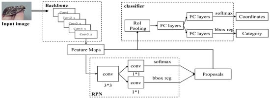 The Faster R-CNN model uses 13 convolutional layers, 13 rectified linear unit (ReLu) layers, and 4 pooling layers to extract image feature maps. The second step is to input the extracted feature map into the RPN and generate candidate regions through the RPN. In the third step, the feature maps and candidate regions input through the RoI pooling layer are collected and synthesized and then recommended feature maps are extracted, and the fully connected layer (FC layer) category is determined to classify the objects.