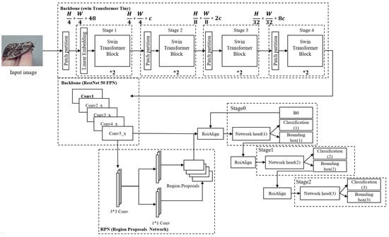 Second, the extracted feature map is input into the RPN to generate a candidate region. Third, the RoI pooling layer processes the input feature map and the candidate region of the RPN, and it sets different IoU thresholds to determine the target category. B0 of stage 0 is used to generate the RPN, and it is a process of classifying objects by classifying the stage output from the network head of each stage into IoU values.