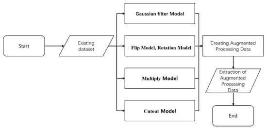 As a result of data augmentation using the Gaussian filter model, 1728 images were obtained. A total of 1728 Flip model images, 1728 Rotation model images, 1728 Multiply model images, and 1728 Cutout model images were added. Therefore, the number of augmented images increased to 8640, and the total image data increased to 9072. The data augmentation techniques applied in Table 2 show the results of data set quantity changes.