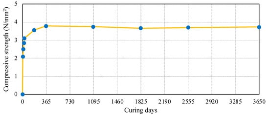 A literature review on the subject shows that many studies on the long-term curing of the uniaxial compressive strength of the granulated blast-furnace slag (GBFS) used for soil improvement have used an initial start-up strength for 28 days. Xu et al. [], Yi et al. [], and Sun and Yi [] studied the stabilization of subgrade soils using the granulated blast furnace slag at different proportions and temperatures. These studies were conducted for a period of one year and it was found that the addition of slag increased the overall strength. When more slag was added, it was shown to significantly reduce the risk of sulfate attack, alkali–silica reaction, and chloride penetration [,,,,,]. Some researchers have even suggested that the material chosen for the chemical injection should possess certain properties [,,,,,].