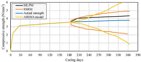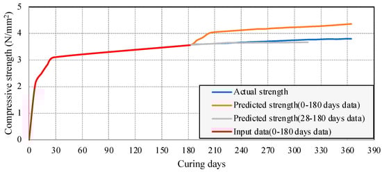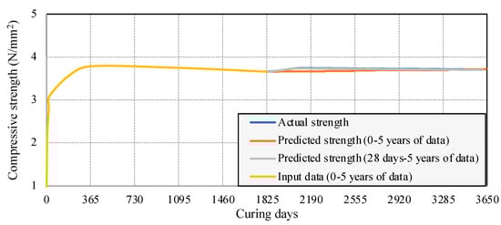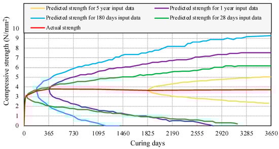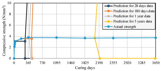 Figure 8 and Figure 9 show the prediction results by the MLP model for the 1-year and 10-year periods, respectively. The predictions were made for 1 year and 10 years using the 180-day and 5-year sets of input data, respectively. The model can only make reliable predictions for periods equivalent to the amount of input data, i.e., for the 10-year prediction, 5 years of input data were required, and for the 1-year prediction, 180 days of input data were required. The predicted strength was 4.34 N/mm2 for 1 year and 3.73 N/mm2 for 10 years. In both cases, the results were predicted for the input data with and without omission of the highly fluctuating 0–28-day data. The reason for this is to obtain results closer to those of the actual experiments. As can be confirmed in Figure 8 and Figure 9, the predicted results for 0–28 days included data-produced results that deviated from the actual results in the initial phase. The reason for this is that the method learns the input data, recognizes the patterns of fluctuations for all the data, and determines the balanced prediction results. If the highly fluctuating part is omitted in the input phase, then its influence on the predicted results will decrease. However, omitting the highly fluctuating part will result in lower predicted results than the actual compressive strength after a certain period. Meanwhile, the results in Figure 8 were observed to be the best fitting to the actual data, with a very small deviation even when the 0–28 days data were included. This is due to the higher amount of input data, and likewise in other models, proportional to the amount of input data. Therefore, the influence of the initial fluctuating part became less. The model was found better than other methods, suggesting that the MLP might be the best prediction model for this study. This study used actual data to compare with predicted results so that the best model can be selected. However, if the actual data are not available, then, based on the trend in the predicted data, the data obtained by omitting the highly fluctuating input data appear more reliable and accurate.