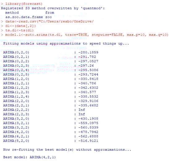In this study, three different prediction models are discussed. The autoregressive integrated moving average (ARIMA) model is a flexible method that can even describe the behavior of nonstationary and seasonal time series []. However, the ARIMA model might be inadequate in certain situations, such as for series describing employment [,]. The state-space representation (SSR) model can represent many statistical models in a unified manner, for example, an analysis of variance, regression analysis, normal linear models, generalized linear models (GLM), generalized linear mixed models (GLMM), ARIMA, generalized autoregressive conditional heteroscedasticity models (GARCH), stochastic variance models (SV), etc. [,,,,,,,]. The machine learning predictive (MLP) model automatically finds patterns in the data and uses those patterns to make predictions [,,,]. These three models were analyzed using the R software.