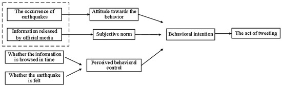 The Theory of Planned Behavior (TPB), proposed by Ajzen I [18], states that individuals’ behavioral intentions can be influenced by a combination of behavioral attitudes, subjective norms and perceived behavioral control. Behavioral attitudes comprise psychological dispositions and sentiments about the target behavior, which can be positive or negative [19], and it is expressed in microblogs as an instinctive expression of sentiments in the aftermath of the earthquake. Subjective norms comprise spontaneous changes in one’s behavior as a result of some societal influence [20]. Based on the above theories, we propose a model of influencing factors that affect people’s behavior in microblogs, where information released by the government and other media affects people’s microblog posts. Perceived behavioral control is the degree to which individuals have mastery over factors that facilitate or hinder their behavioral performance [21], and it is expressed in microblogging as whether people feel the earthquake and whether the information posted by official media outlets that they view also changes their behavior with regard to posting microblogs. Therefore, in addition to the people’s own perceptions of earthquake risk in the process of posting microblogs, information from government media and other media and whether they browse such information in time also have some influence on people’s behavioral sentiments. The model of the factors that influencing people’s behavior is shown in Figure 1.