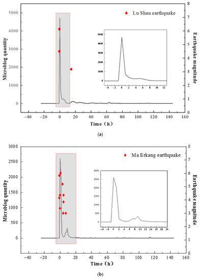 A comparative analysis of the three earthquake events showed that people’s attention was influenced by the time of the earthquake. As the number of people’s microblog posts increased sharply 1~2 h after the earthquake, people’s attention increased sharply, and they had a stronger desire to express themselves. Thereafter people’s sentiments will be changed by the ongoing social impact of the earthquake. The larger the social influence range, the deeper the severity, and the more the number of microblog posts, the stronger the attention.