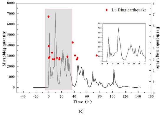 Figure 2a–c show the change in the number of people’s microblog posts over time during and 144 h after the Lushan, Maerkang and Luding earthquakes, respectively. The data from the Lushan and Maerkang earthquakes show that the number of microblog posts reached a peak within an hour after the quake (4704 for the Lushan earthquake and 2602 for the Maerkang earthquake) and then showed a rapid downward trend thereafter. On the morning after the Malcolm earthquake, there was a small fluctuation in the number of microblogs, as people were concerned about the earthquake situation, and there was a small peak of 328 at 9 h (9:00) after the quake, followed by another decline. The first peak of 5177 microblogs was reached within two hours after the earthquake in Luding, and aftershocks occurred many times afterwards, with seven aftershocks of M3.0 and above up to 21:00 on 5 September. These frequent earthquakes triggered a second round of public opinion, and the number of microblogs reached a maximum of 7121 within 10 h after the earthquake (22:00–23:00 on 5 September) until 0:00 on 6 September. The number of microblog posts was mainly concentrated in the daytime, with fewer posts in the evening, while the number of microblog posts showed a trend of gradually decreasing.