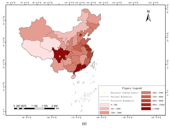 The spatial sequence distributions of the microblog posts posted 144 h after the earthquakes in Lushan, Maerkang and Luding are shown in Figure 3a–c. In terms of spatial distribution, the three earthquakes received a high degree of attention from people in the southern region and relatively less attention from people in the northwestern region. The people in the main quake area posted the highest number of posts for all three earthquakes, and the people in Guangdong Province posted the second highest number (4422, 5195 and 15,261 microblogs were posted by people in Sichuan, and 753, 439 and 14,005 microblogs were posted by people in Guangdong), with the people in Sichuan, as the location of the source of these three earthquakes, posting the highest number of microblogs with the most attention. There are two main reasons for the high level of public concern in Guangdong: (1) Guangdong, as a major region for natural disasters, such as meteorology, is prone to “empathic” behavior and also has a high level of concern for earthquake events; (2) most of the laborers transferred from outside Sichuan Province are distributed in Guangdong (Chencheng 2014) [22], a developed region with service and manufacturing industries, and when the earthquake occurred in Sichuan, the phenomenon of “empathy” was generated out of concern for their hometowns and loved ones, so they focused on the Sichuan disaster. Other regions with high concern are mainly concentrated in Beijing, Jiangsu and Zhejiang.