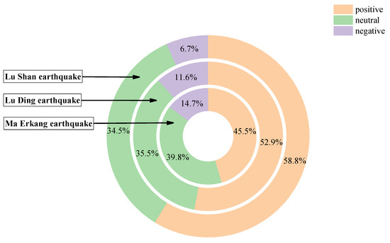 The proportions of positive, negative and neutral sentiments in the content of each microblog comment were calculated and classified according to the three earthquakes, and the results are shown in Figure 4. Among the comments posted by users, positive sentiments dominated for all three earthquakes, followed by neutral sentiments, and negative sentiments accounted for the smallest proportion. The main reason for this is that the time interval between two of the earthquakes was only 9 days, and the frequent earthquake disasters made people’s sentiments change from positive to negative. People’s positive sentiments after the Luding earthquake decreased by 5.9% compared with those after the Lushan earthquake.