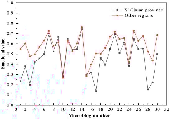 In order to investigate the main sources of the three types of sentiments of people after the earthquakes, this paper classifies the provinces where people commented on microblogs in the three earthquakes into Sichuan and non-Sichuan regions, and it collates the number of people’s sentiments according to the different regions. The smaller the value, the more negative the sentiment, and the larger the value, the more positive the sentiment; a value above 0.5 is regarded as positive sentiment, a value below 0.5 is regarded as negative sentiment, and a value equal to 0.5 is regarded as neutral sentiment. For example, a value of 0 indicates extreme negative emotions, and a value of 1 indicates extreme positive emotions [23]. This paper demonstrates the changes in the sentiments of the people in Sichuan and those of the people in other regions, as shown in Figure 5, where microblogs 1–16 indicate the people’s sentiments of the Luding earthquake, microblogs 17–27 indicate the people’s sentiments of the Lushan earthquake, and microblogs 28–30 indicate the people’s sentiments of the Maerkang earthquake.