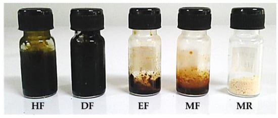 Physical appearances of E. debile hexane fraction (HF), dichloromethane fraction (DF), ethyl acetate fraction (EF), methanol fraction (MF), and methanol insoluble residue (MR).