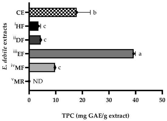 Total phenolic contents (TPC) of E. debile extracts. i–v Successive partition of crude extract (CE) (10.45 ± 1.20 g) into hexane fraction (HF), dichloromethane fraction (DF), ethyl acetate fraction (EF), methanol fraction (MF), and methanol insoluble residue (MR). All data are presented as mean ± SD of triplicates. Total phenolic contents were expressed as GAE (gallic acid equivalents). ND indicates not detected. Letters (a, b, and c) indicate significant differences of means between the groups based on Tukey’s HSD one-way ANOVA (p-value < 0.05).
