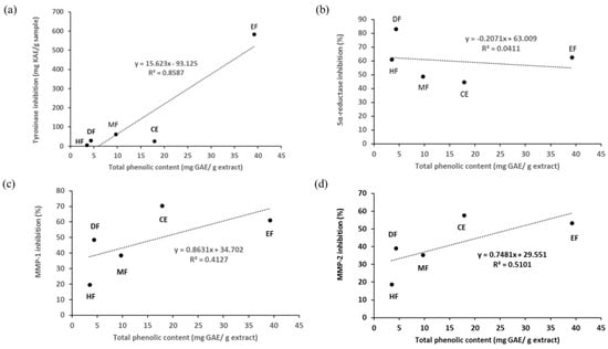 Relative scatter plot of total phenolic content and inhibition activities of crude extract (CE), hexane fraction (HF), dichloromethane fraction (DF), ethyl acetate fraction (EF), and methanol fraction (MF); (a) anti-tyrosinase activity (regression p-value = 0.0236); (b) anti-5α-reductase activity (regression p-value = 0.7437); (c) anti MMP-1 activity (regression p-value = 0.2424); and (d) anti MMP-2 activity (regression p-value = 0.1753).