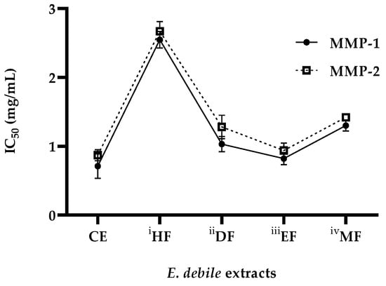Anti-collagenase activities of E. debile extracts. i–v Successive partition of crude extract (CE) (10.45 ± 1.20 g) into hexane fraction (HF), dichloromethane fraction (DF), ethyl acetate fraction (EF), methanol fraction (MF), and methanol insoluble residue (MR). Anti-collagenase activities were expressed as IC50 (the half maximal inhibitory concentration) of MMP-1 and MMP-2, which are the matrix metalloproteinase type 1 and 2, respectively. All data are presented as mean ± SD of triplicates.