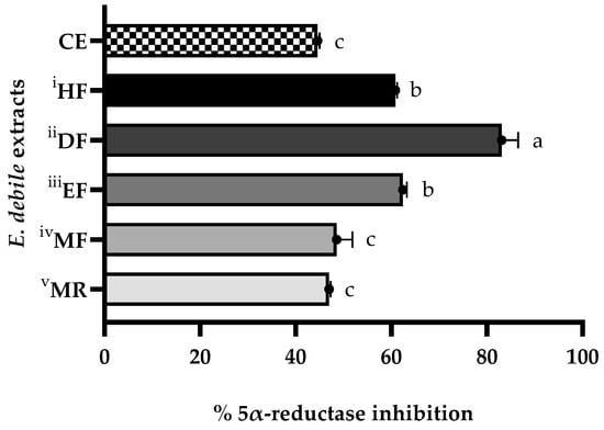 Anti-5α-reductase activities of E. debile extracts. i–v Successive partition of crude extract (CE) (10.45 ± 1.20 g) into hexane fraction (HF), dichloromethane fraction (DF), ethyl acetate fraction (EF), methanol fraction (MF), and methanol insoluble residue (MR). All data are presented as mean ± SD of triplicates. Letters (a, b, and c) indicate significant differences of means between the groups based on Tukey’s HSD one-way ANOVA (p-value < 0.05).
