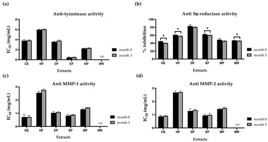 Storage conditions can affect phytochemical stability, leading to changes in the potency and efficiency of extract bioactivities. Therefore, in the present study, all E. debile extracts were kept under an accelerated storage condition at 40 °C for three months to assess the stability of bioactivities as shown in Figure 10. No statistically significant differences were observed in the activities of tyrosinase and collagenase (MMP-1 and MMP-2) inhibitions between month 0 and month 3 of all extracts (p-value > 0.05). However, slightly decreased activities of 5α-reductase inhibition for CE, HF, EF, and MR were observed to be significantly different after 3 months (p-value < 0.05).