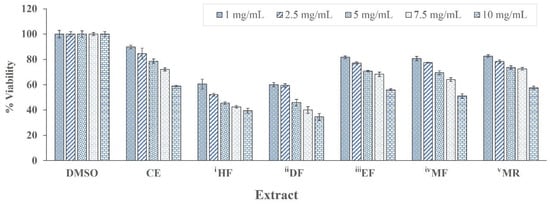 The cytotoxicity of E. debile crude extracts and semi-purified fractions were evaluated in a skin fibroblast cell line (SF-TY) by the MTT assay. The highest cell viabilities were observed in the cell cultures treated with CE, EF, MF and MR, which also exhibited viabilities higher than 50% across all tested concentrations (Figure 11).