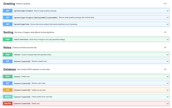 The application model definition was based on the API specification (in OpenAPI 3.0 format) that should be implemented in the microservice created with the given framework. A graphical representation of the API description is presented in Figure 1. All of the 11 endpoints provided in the specification can be divided into 4 main categories.