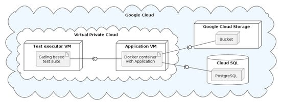 All performance tests were executed using the same cloud environment with the same resource allocation. Due to previous experience with the platform, as a cloud provider, Google Cloud was chosen to conduct the experiments. This choice was not crucial, however, as generic computing resources (VPS, referred to by GCP as Compute Engine) were used to conduct the experiments, and no services specific to the chosen cloud computing provider were used. It could be easily replaced with another provider. To provide isolation and constant resources application and test machines were launched using Linux-based virtual machines with allocated (non-shareable) resources inside VPC (virtual private cloud) to provide direct HTTP connection between machines—machine resource configurations are presented in Table 3 and Table 4. External resources such as database and cloud storage were assigned as well. A simplified schema of the test bed is presented in Figure 2.