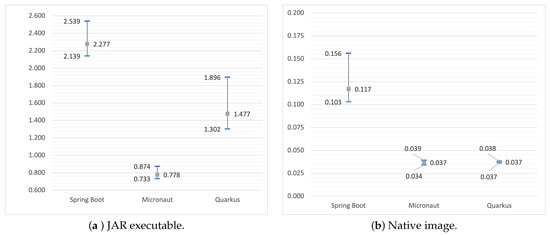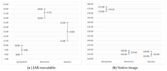 Analyzing the compilation time under test (Figure 3), we can see the different approaches taken in the Micronaut and Quarkus directly impacting the results and translating into the application start time. Spring Boot relies on the reflection and proxies in its IoC container implementation and uses it in the dependency injection process. Based on the Spring framework experience and awareness of the burden the usage of runtime-based techniques combined with reflection and proxies carries, the others tend to minimize their use in their IoC/DI solutions and leverage ahead-of-time compilation as much as possible. It is worth noting that Spring also starts to go towards that direction with the announced initial AOT support and optimization at the build time forthcoming with Spring 6.0. Independently from the executable format, we can see the benefits of that approach which, however, comes at a price. The compilation time for JAR files is noticeably longer for the Micronaut and Quarkus as they shift most of the operations that (in the case of Spring Boot) are done in runtime to the compilation time. Nevertheless, this gives the significant benefit of a shorter startup time (Figure 4a) that can be crucial from the point of view of autoscaling. We can see a bit of a different effect for the compilation time in the native image (Figure 3b). Higher reliance on the reflection causes an increase in it, as it must be registered upfront and probably requires additional operations during compilation. Yet, as in the case of the JARs, the achieved startup times by Spring Boot are worse than the competition (Quarkus and Micronaut) (Figure 4b). Moreover, regarding the compilation time for the native image, we can see that both Quarkus and Micronaut achieved almost the same and the best result. When considering the JAR executable, Micronaut is the leader. The usage of the custom fast-jar approach in the Quarkus, which for some time has been the default approach in the framework, still is a bit behind the fastest competitor. As part of the observations made, it is worth noticing that Micronaut, by default, uses lazy initialization. It results in a much longer time to handle the first request (around 1–3 s) as the underlying components, such as services, etc., are only created. Possibly, these could impact the visible dominance of the Micronaut in terms of the startup time for the JAR executable.
