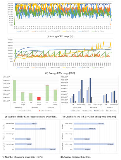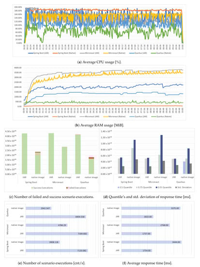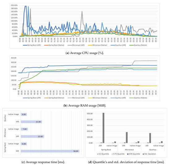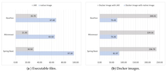 Docker images were built using the same base image for each executable form using a multistage build. For the final image, the Debian bases images were used as the foundation (openjdk:17-slim-bullseye or debian:bullseye). In terms of JAR files, it is worth mentioning that for the Quarkus, the recommended “fast-jar” approach was used. The whole directory generated with executable was considered, as the entire content in this directory is needed to run the application. Achieved results are presented in Figure 5.