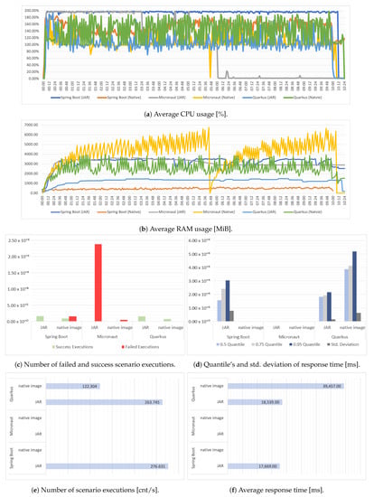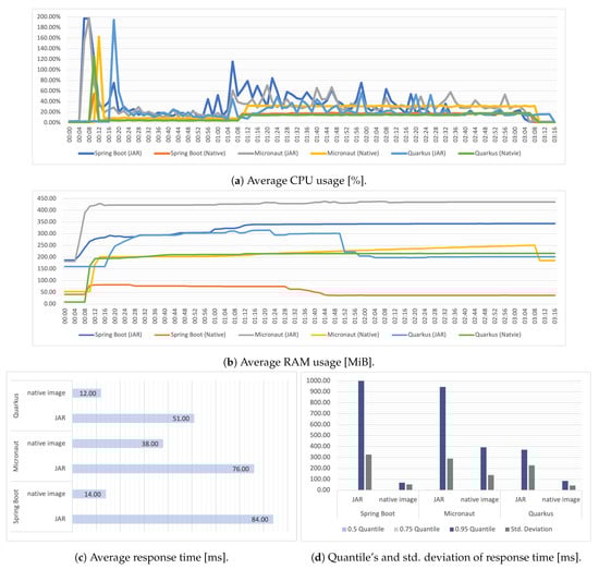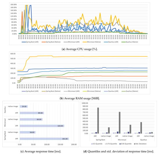 Subsequent average load tests showed an interesting result. In their case, the native image application performed better for each framework. In connection with the lower use of resources, it can be concluded that by using a well-functioning automatic scaling mechanism that would prevent the emergence of extreme situations, which were the subject of the previous tests, we could use this executable form of the application to obtain a more efficient system. The mean response time results obtained in these tests show much more pronounced differences between the templates in the case of JAR files. In this respect, Quarkus fared best. It is worth noting that in some cases, the Micronaut template obtained similar results.